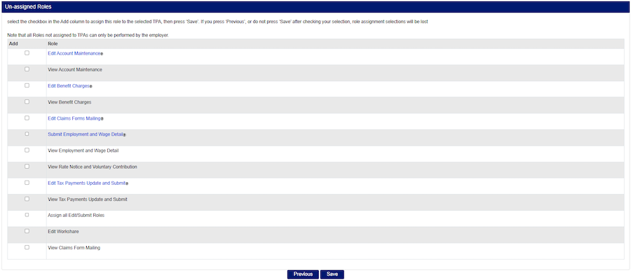 - Edit Employment and Wage Detail - A TPA with access to this role is able to submit wage reports, and submit wage adjustments on behalf of the employer. They can also view submitted reports.